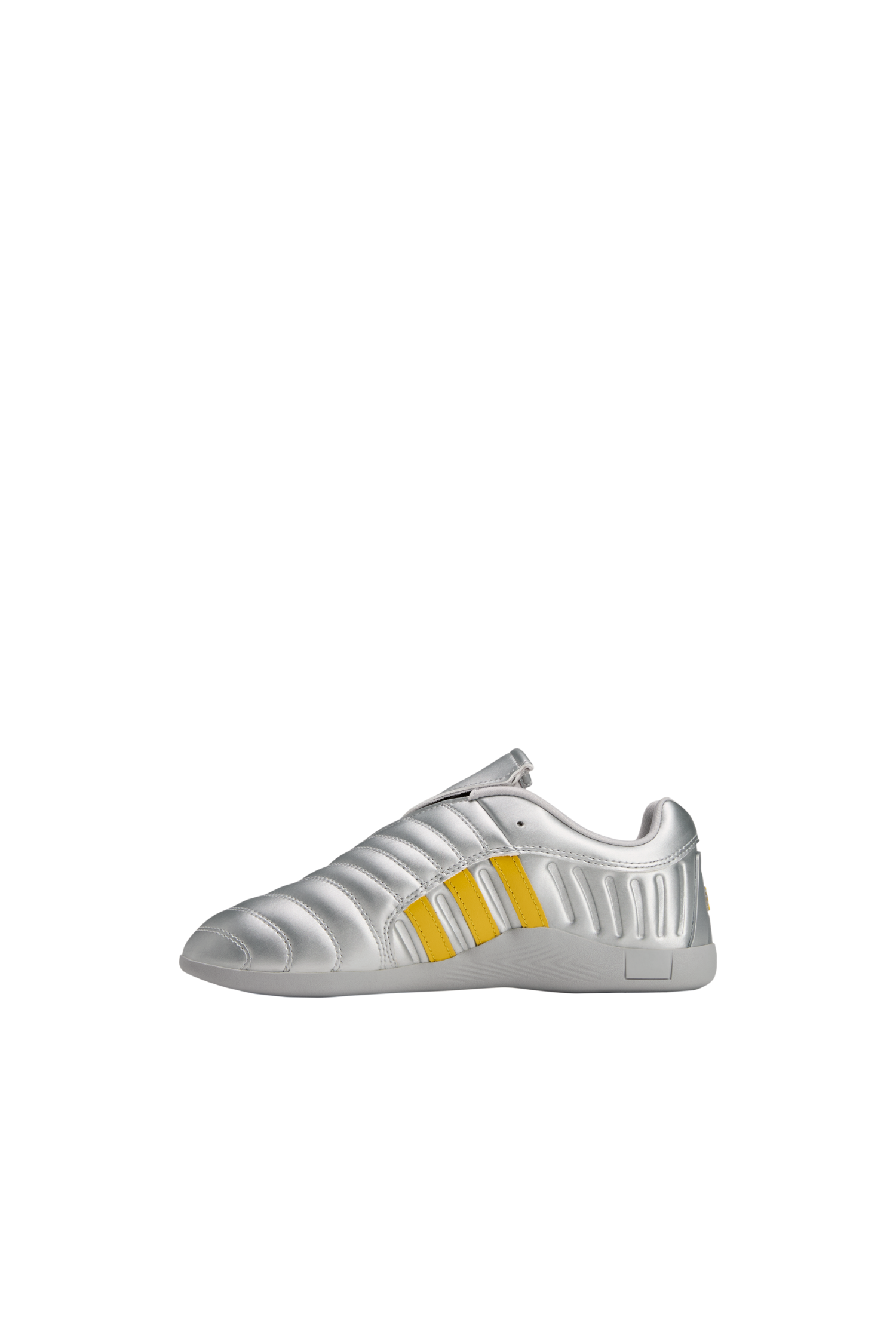 Miaou's latest collaboration shoe with Adidas, celebrating sportiness and sensuality. The Elite Mei features a silver satin upper with contrasting yellow stripes and embroidered “M” branding on the tongue. Comes with an extra pair of silver laces.