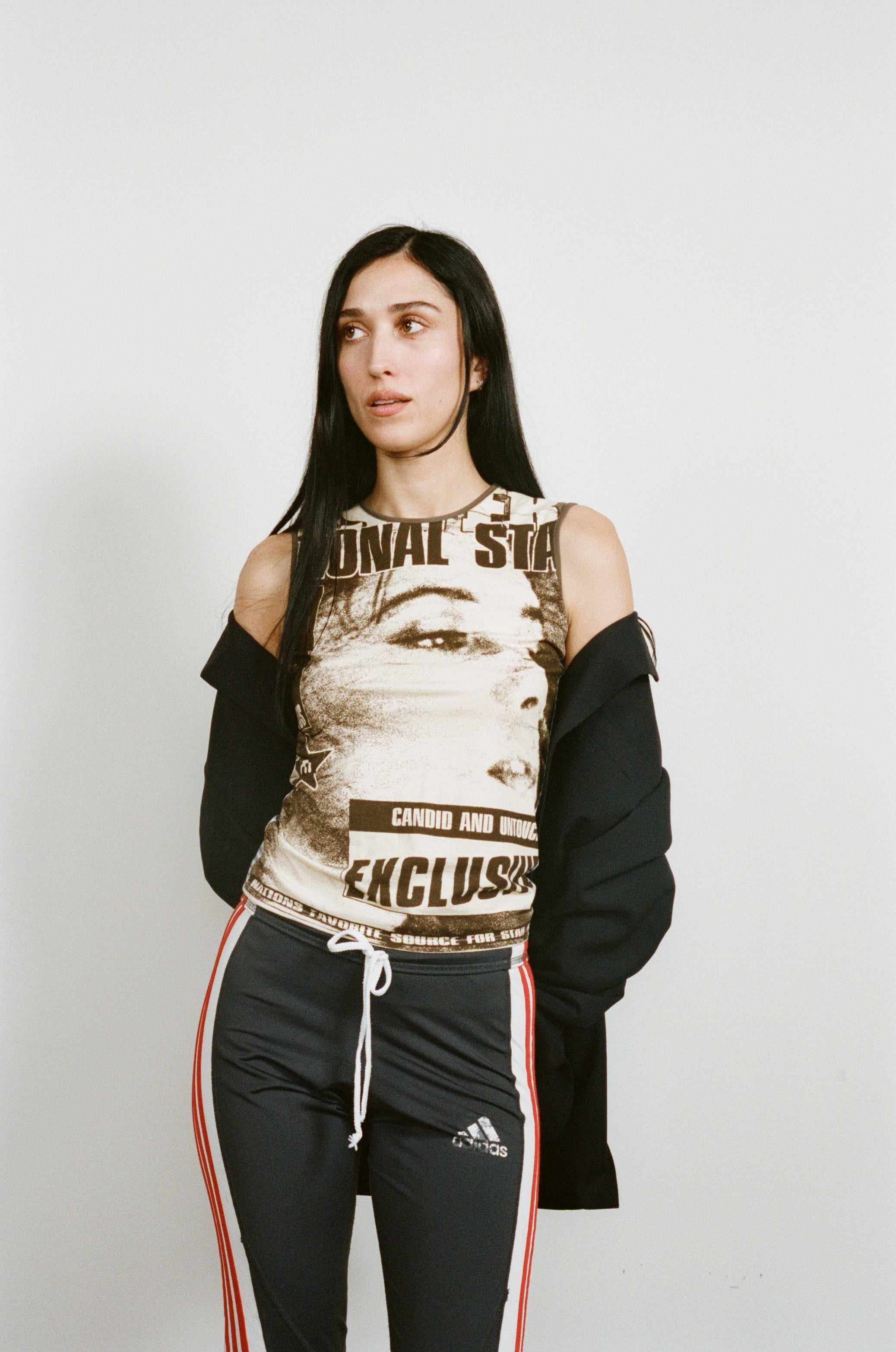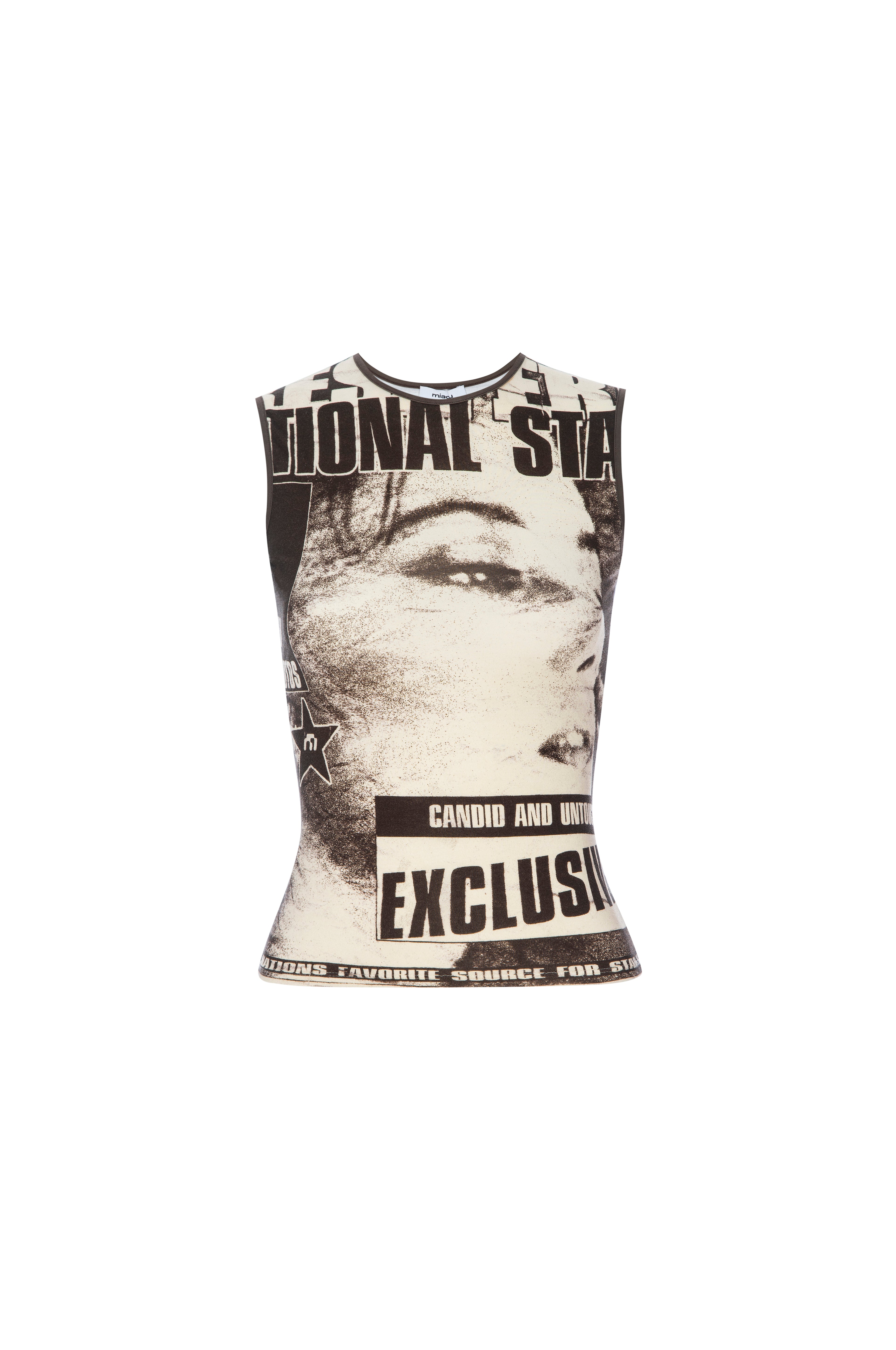 Meet our Drew Top in Covergirl. This crew-neck muscle tee is crafted from a form-fitting cotton blend and features a custom design on the front. You'll love her.